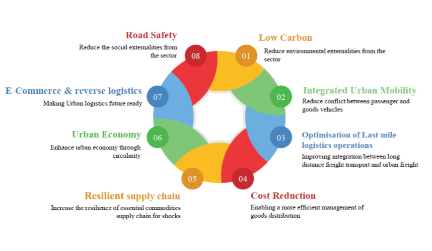 The action plan prioritises strategies that focus on promoting transportation of goods with minimised impacts on air quality, noise, health, fatalities, and injuries, besides reducing traffic congestion and GHG emissions. It is the first time that low-carbon strategies for urban freight have been developed by an Indian city. The dual purpose of the action plan is to position policymakers to reduce GHG emissions from the sector, mitigating externalities, while also improving efficiency. To formulate specific actions, it was crucial to identify the key goals of various stakeholders associated with the sector.