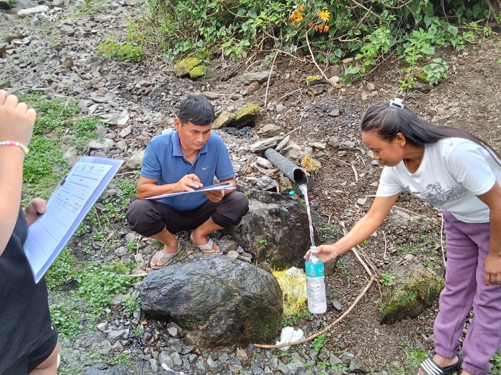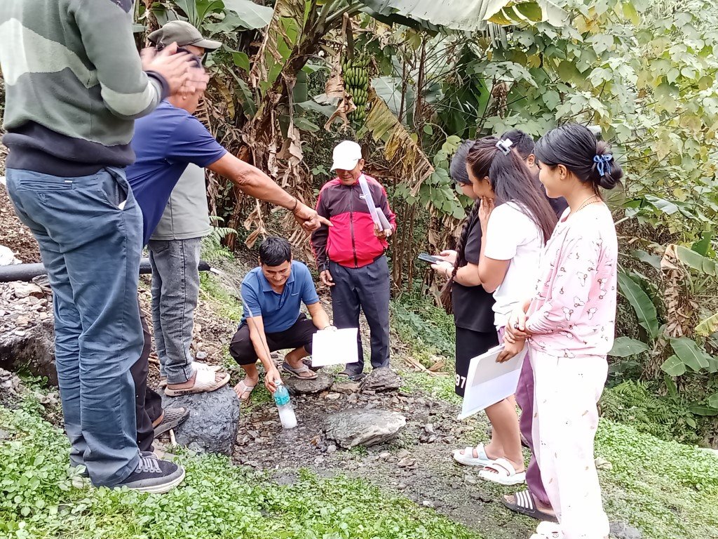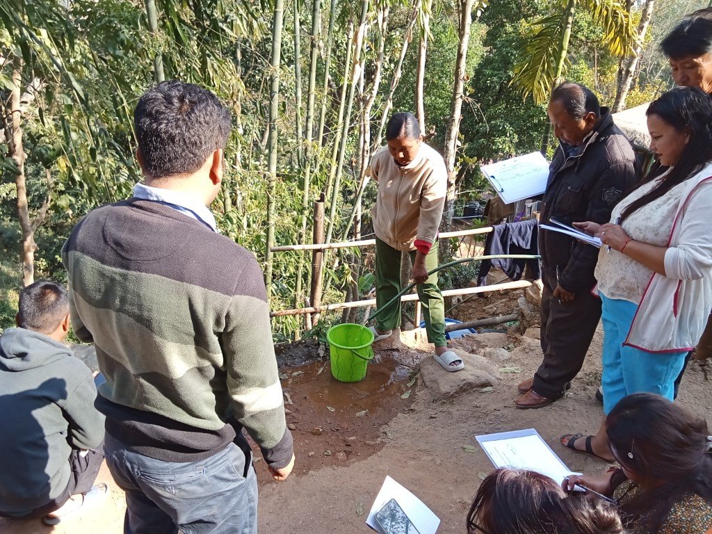 This was the second phase of community trainings, developed on the basis of the first phase, where theoretical knowledge on the fundamentals of water resources and its management was imparted. In the second phase, the community members were introduced to methods of assessing water demand and supply (spring discharge). They were trained on simple methods of discharge measurement from spring sources, which include the bucket method, water-level drop method in natural springs, and water-level drop method in springs with a storage tank.