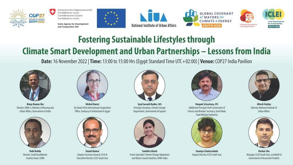 At the 27th Conference of the Parties of the UNFCCC (COP 27), ICLEI South Asia along with the National Institute of Urban Affairs, with support from the Swiss Agency for Development and Cooperation, Climate Development and Knowledge Network is organising a session on Fostering Sustainable Lifestyles through Climate Smart Development and Urban Partnerships – Lessons from India at the India Pavilion, Sharm El-Sheikh International Convention Center from 13:00 to 15:00 Hrs (Egypt Standard Time UTC+02:00).