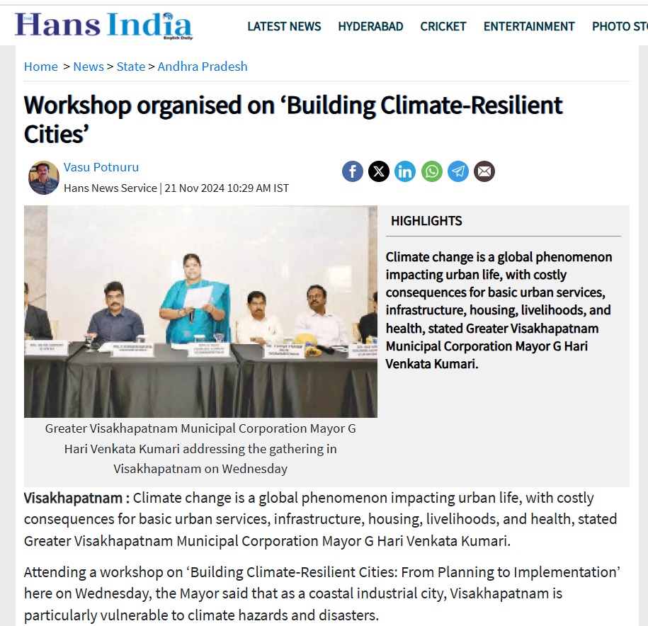 As part of this project, a workshop titled ‘Building Climate-Resilient Cities: From Planning to Implementation’ was convened in Visakhapatnam on 20 November 2024. The workshop was designed to equip city officials with the tools and knowledge essential for developing city-level climate-resilient and net-zero action plans and for enabling long-term climate-resilient planning in the three cities.