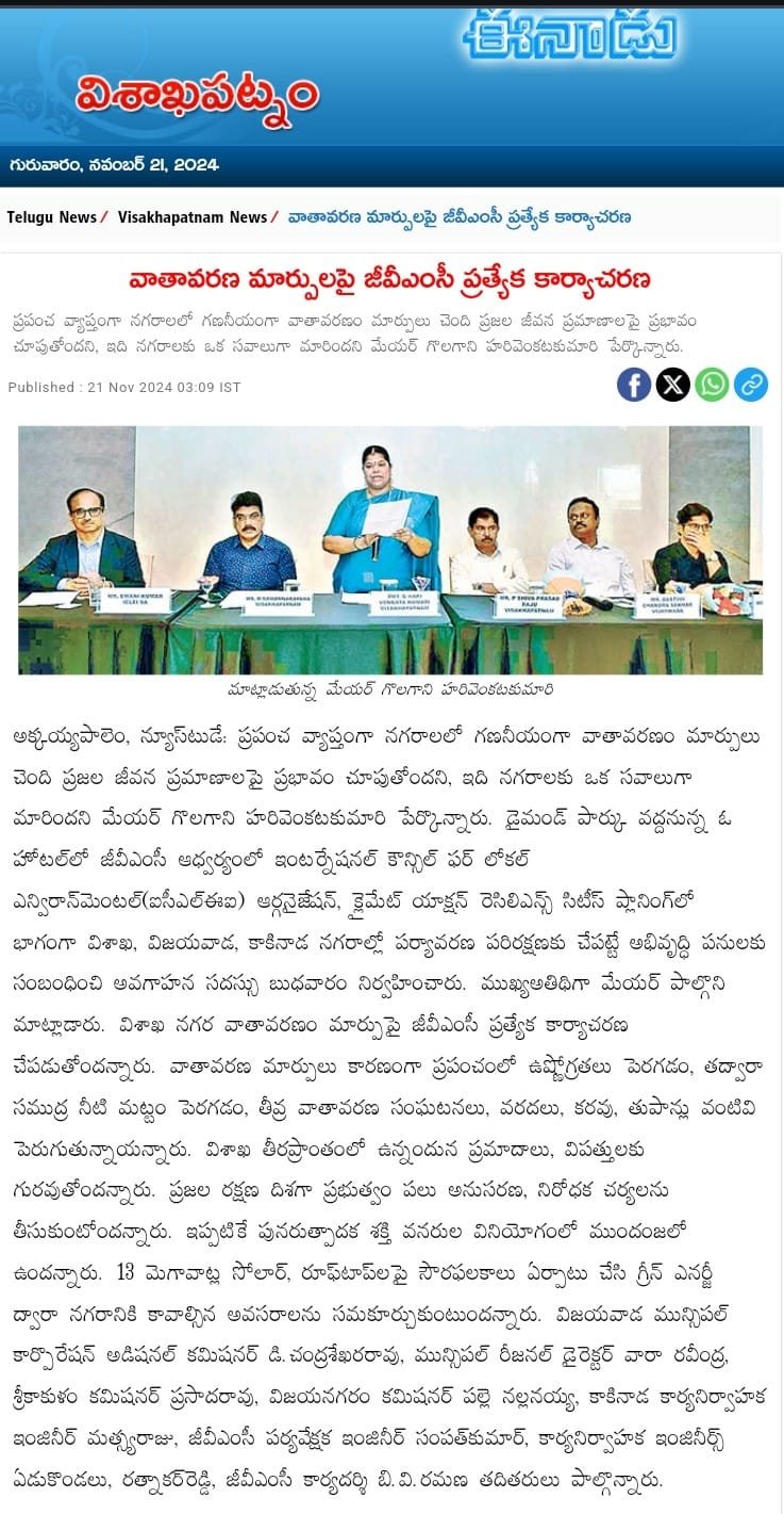 Taking cognizance of Andhra Pradesh’s recently announced visionary goal to achieve net zero emissions by 2047, the cities of Kakinada, Vijayawada, and Visakhapatnam have been implementing the “Mainstreaming Climate Actions in Andhra Pradesh” project. This initiative aims to support cities in embedding climate considerations into urban planning, financing, and service delivery. With support from ICLEI South Asia and C40 Cities, the three cities are developing Climate-Resilient City Action Plans, which include ward-level climate risk vulnerability assessments, greenhouse gas (GHG) emissions inventories, and emissions reduction scenario planning.