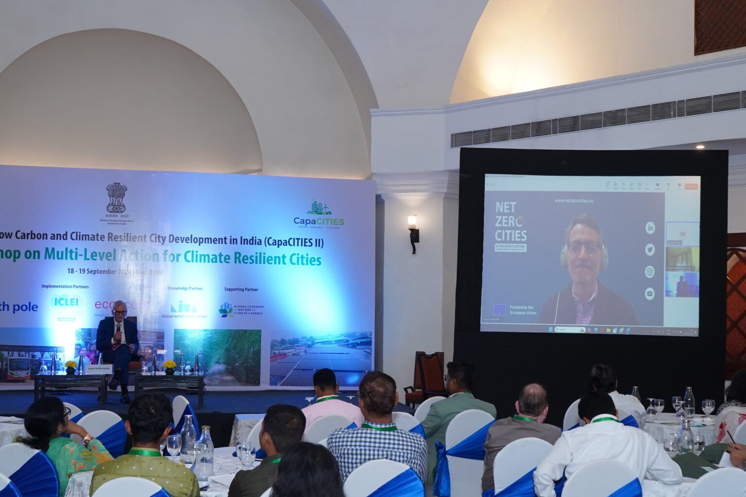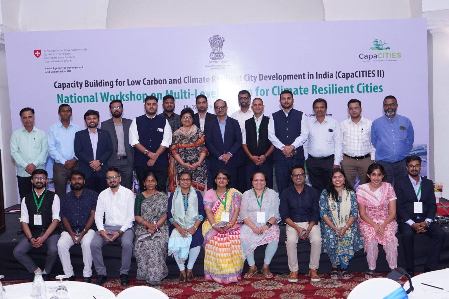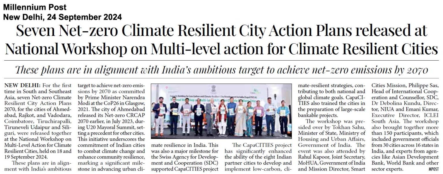 - The National Level Workshop saw participation from 27 city governments across 16 states, including engineers, deputy commissioners, sectoral experts, research institutes and other non-government agencies. As highlighted by Soumya Chaturvedula, Deputy Director, ICLEI South Asia, the CapaCITIES project supported cities in developing pilot projects including an urban flood early warning system in Tirunelveli, solar powered opportunity charging stations for electric buses in Ahmedabad, catchment area and watershed management approaches in urban planning and restoration of water bodies in Tiruchirappalli, implementation of a green mobility zone in Udaipur, implementation of Miyawaki forests in Vadodara, Udaipur and Siliguri, a scale-up case of a waste to bio-CNG facility and a floating solar project in Coimbatore, among others.