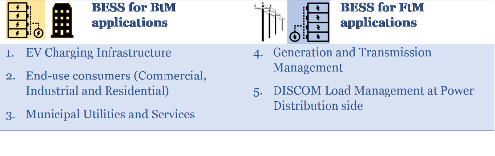The role of BESS can be pivotal to achieving the grid flexibility required to integrate the growing RE and EV deployments. The implementation of BESS for behind-the-meter (BtM) applications like EV charging stations, municipal services and at end-consumer premises (industrial, commercial and residential) can help reduce the peak load, energy consumption from the grid, along with maximising the utilisation of RE and also serve as a power backup to run the operations during grid outages. Front-of-the-meter (FtM) BESS has various applications, ranging from providing ancillary services support and optimising RE generation to the deferral of investments in grid infrastructure upgrade.